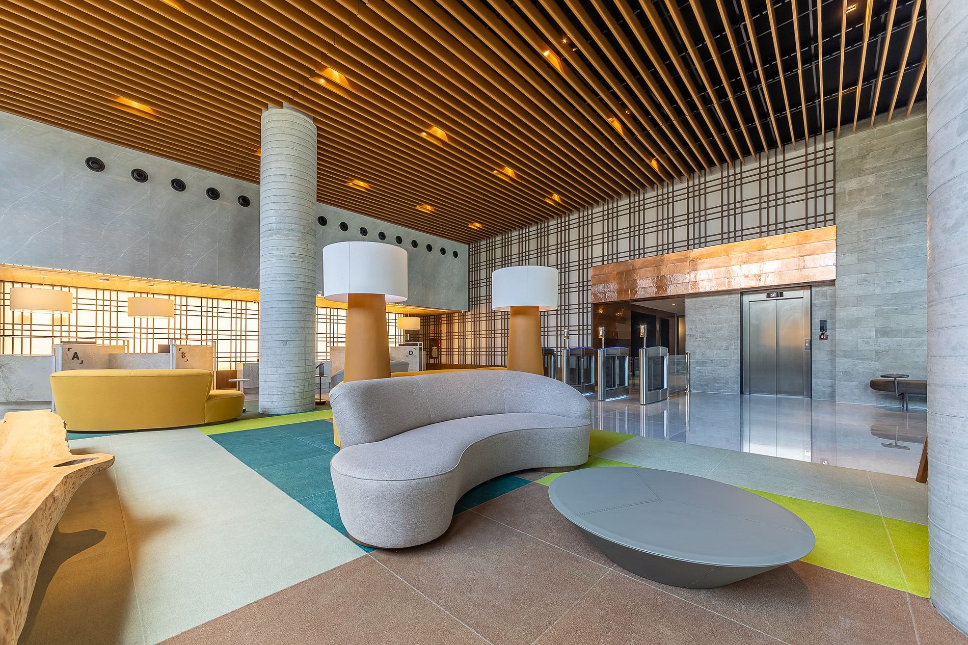 Os elevadores panorâmicos são um diferencial à parte, com vista para o mar durante o trajeto, trazendo uma experiência única desde a circulação pelo edifício.